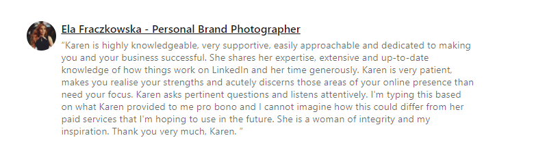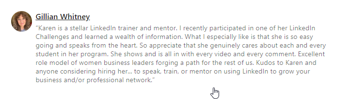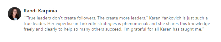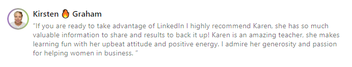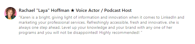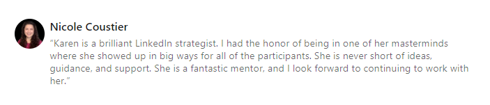 Karen is like an encyclopedia of good, practical advice. Whether it's on her Good Girls Get Rich podcast, her group sessions for her She's LinkedUp Accelerator, or even her impromptu live sessions, Karen always offers at LEAST one nugget of incredible wisdom every single time to make your effort worthwhile. She's humble, relatable, and brilliant all wrapped up in one amazingly nice and sincere person.